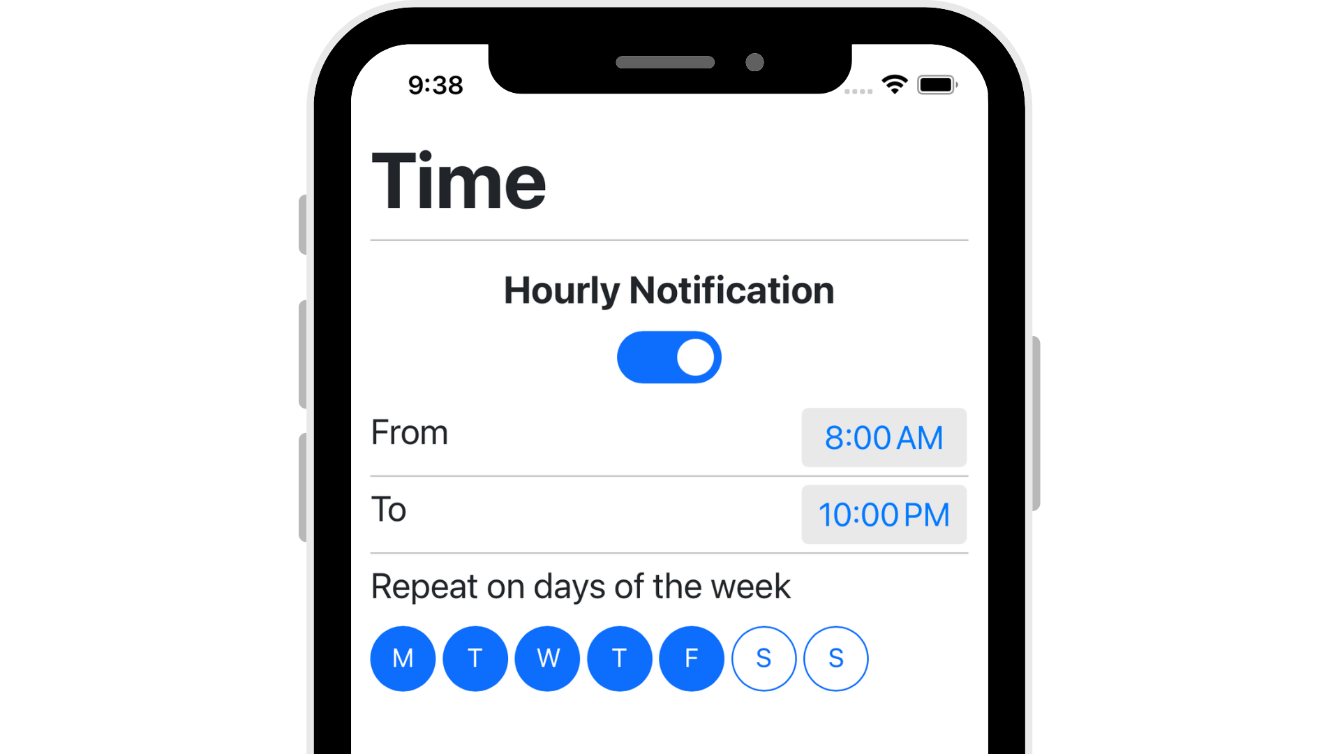 Choose on which days and during which times you want to be notified hourly. Remember the hourly time signal of casio watches? Now you can customize it so you can sleep in peace.